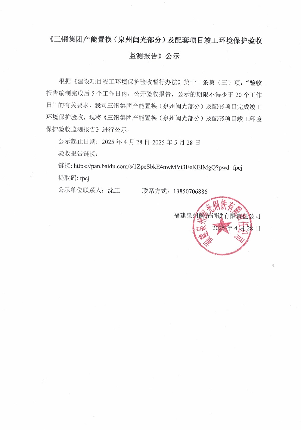 《三鋼集團(tuán)產(chǎn)能置換(泉州閩光部分)及配套項目竣工環(huán)境保護(hù)驗收監(jiān)測報告》公示