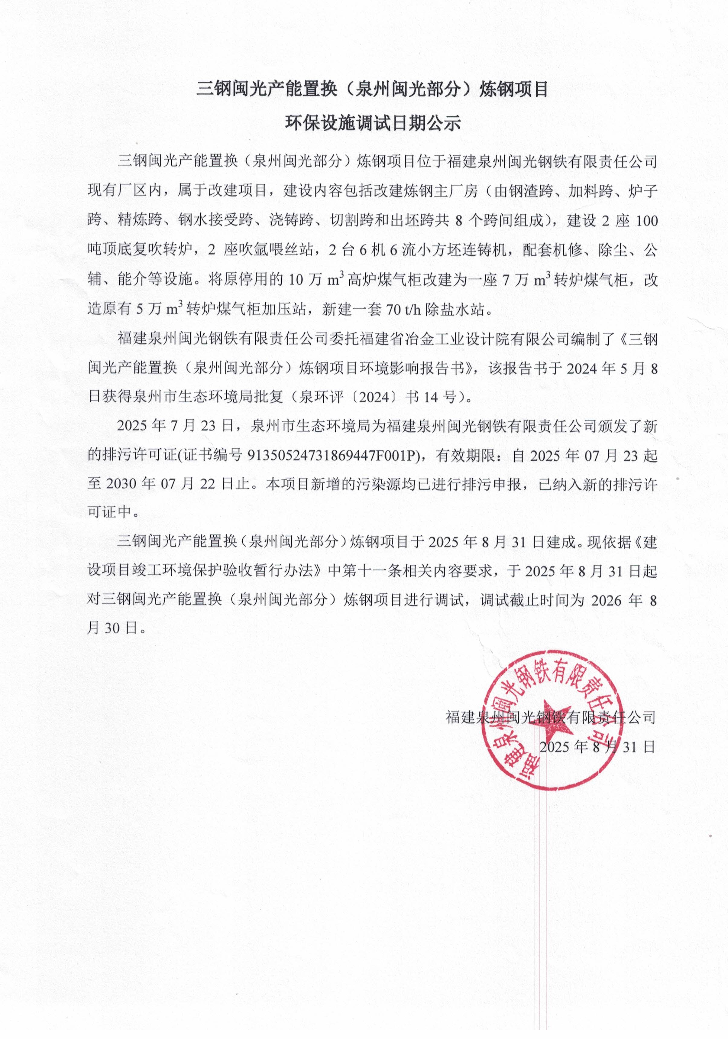 三鋼閩光產(chǎn)能置換(泉州閩光部分)煉鋼項目環(huán)保設施調試日期公示