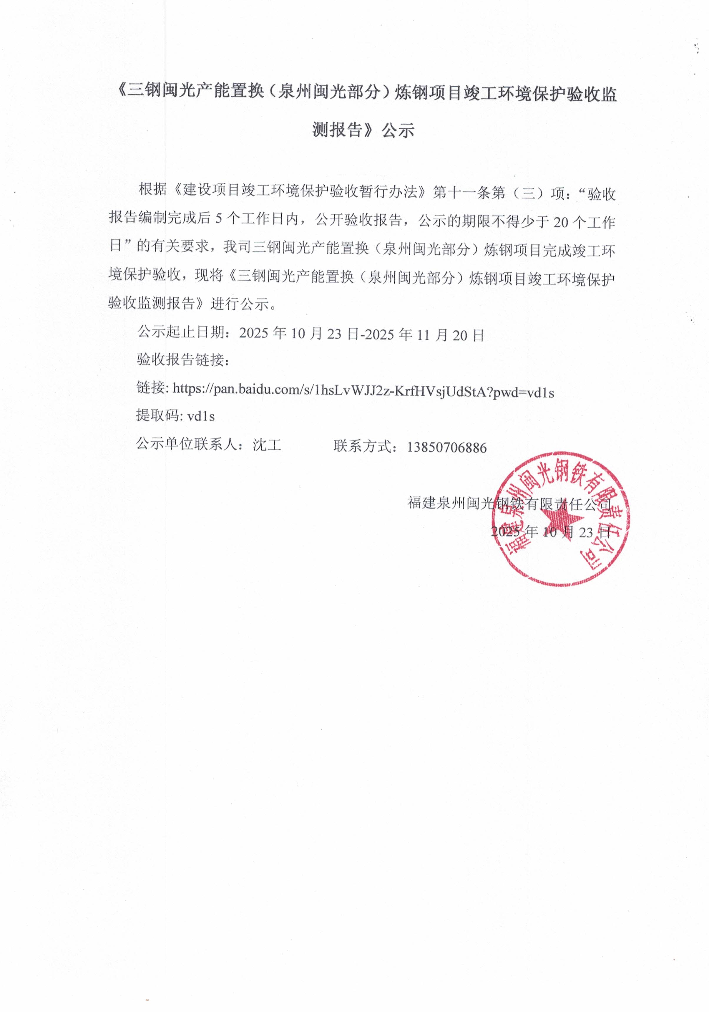 《三鋼閩光產(chǎn)能置換(泉州閩光部分)煉鋼項目竣工環(huán)境保護驗收監(jiān)測報告》公示